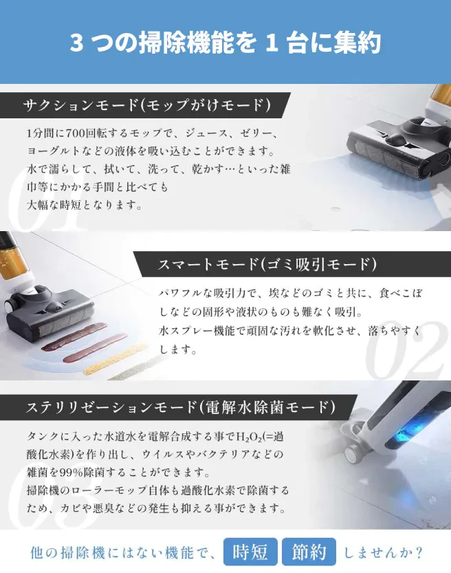 ✅ 掃除機とモップの2役を同時にこなすから、時短&手間いらず!