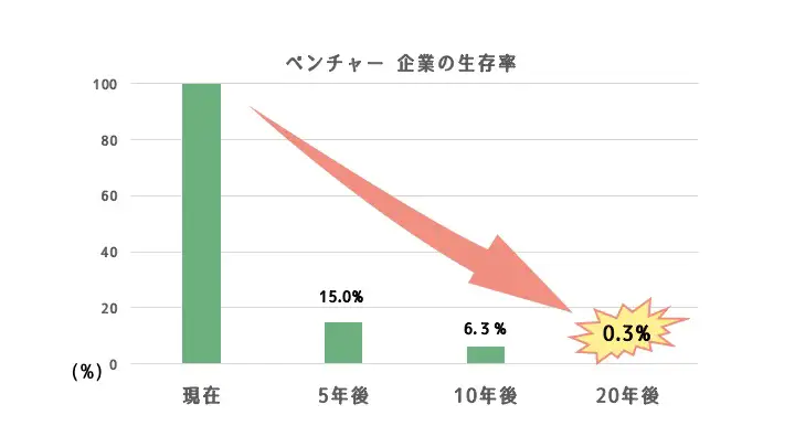 日本企業が設立から10年後に生存している確率がどのくらいか、ご存知でしょうか?中小企業庁が公表しているデータによると、企業の10年後生存率は6.3%、20年後はたった0.3%です。
