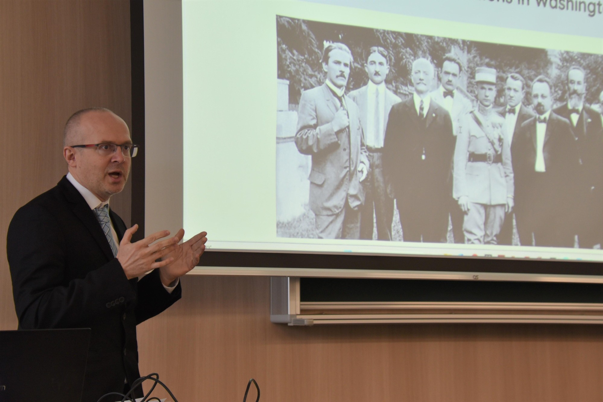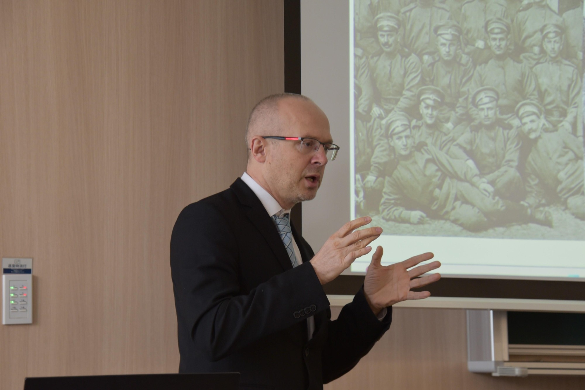 中央ヨーロッパにあるスロバキア共和国の軍事史研究所で主任研究員を務めるペーター・ホルバートさんが12月3日、ナゴヤドーム前キャンパスで行われた都市情報学部の稲葉千晴教授が担当する3年次開講科目「都市と国際関係」でゲスト講師として登壇し、第一次世界大戦時に「チェコスロバキア軍団」と呼ばれた軍事組織の成り立ちや1918年のチェコスロバキアの独立に果たした役割、知られざる日本との関わりなどを解説しました。