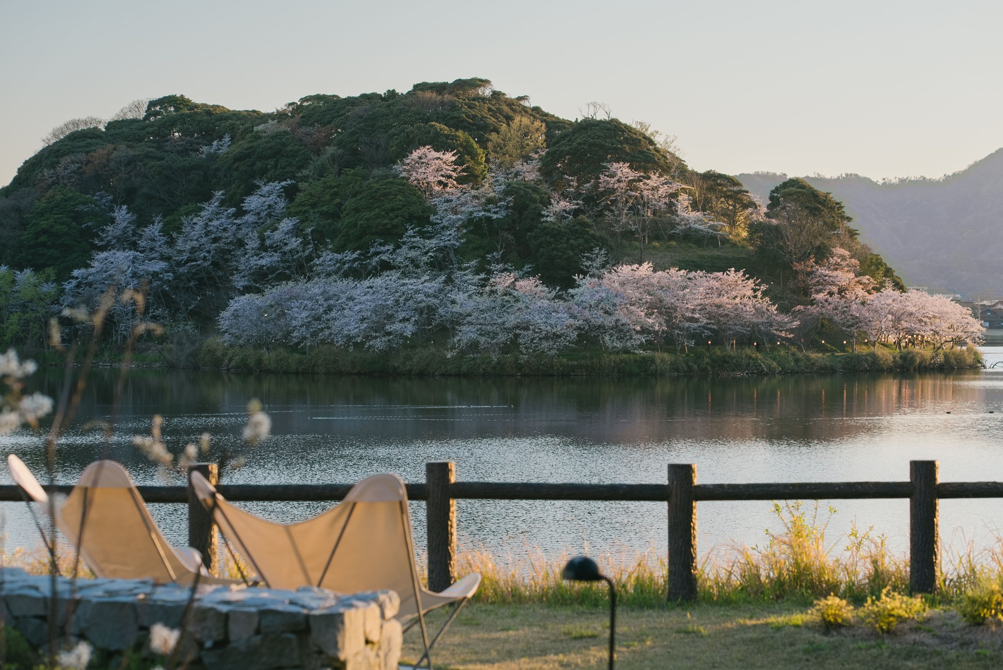 桜がまだ愉しめる、京都最大の湖の眺め。八重桜がこれから開花「風景とナチュラルワインをペアリングする大人のお花見」 京都・丹後「HOTEL&湖邸 艸花 -そうか-」