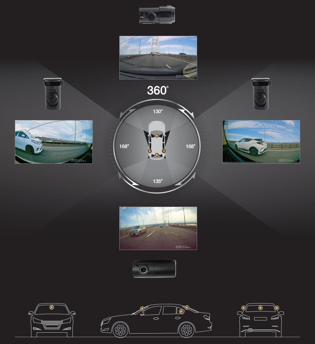 1. 前・後・左・右の4方向をフルHD画質(1920×1080)で同時録画します。