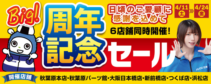 パソコン専門店「パソコン工房」の計6店舗(秋葉原本店・秋葉原パーツ館ならびに大阪日本橋店、新前橋店、つくば店、浜松店)にて日頃のご愛顧に感謝を込めた「周年記念セール」を4月11日(土)より期間限定で同時開催!「オススメ即納パソコン」を豊富に取り揃え!PCパーツ・周辺機器等のセール商品を記念プライスにてご提供します