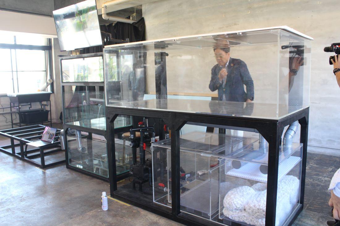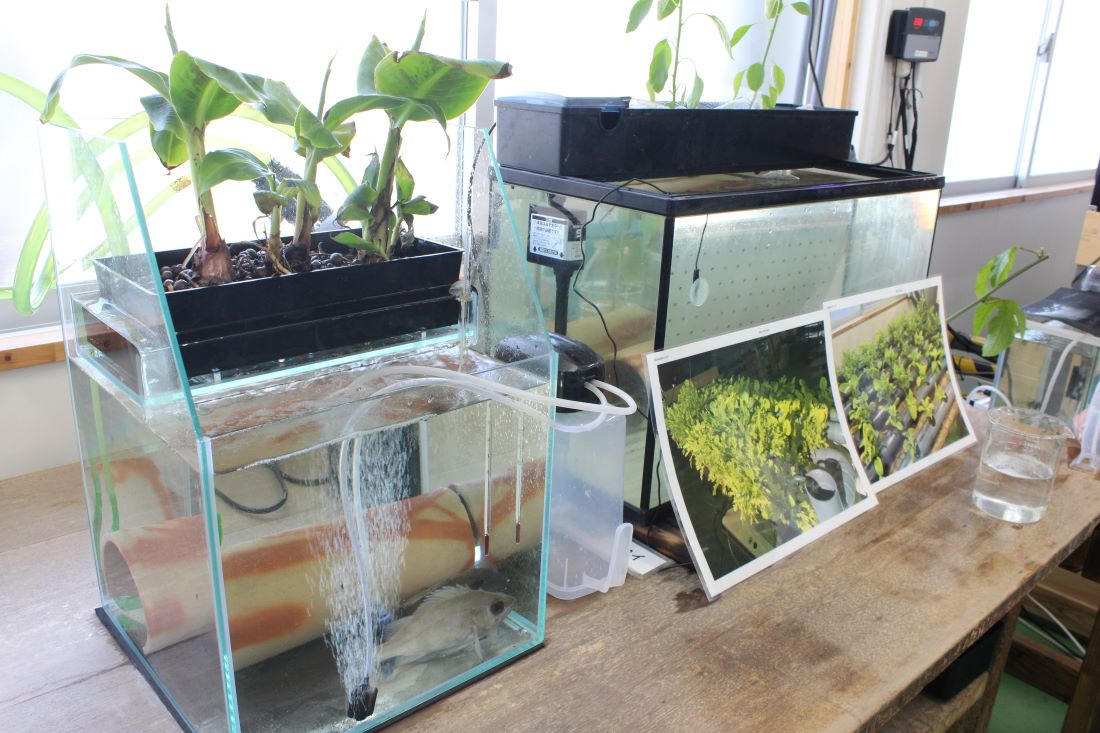 今年度は新たに中庭に大型のアクアポニックス設備を建設しているほか、実習室の一つを「アクアポニックスルーム」として、新たに装置も自作。6月にはハタ科の高級魚「タマカイ」の稚魚約50匹の養殖に着手します。