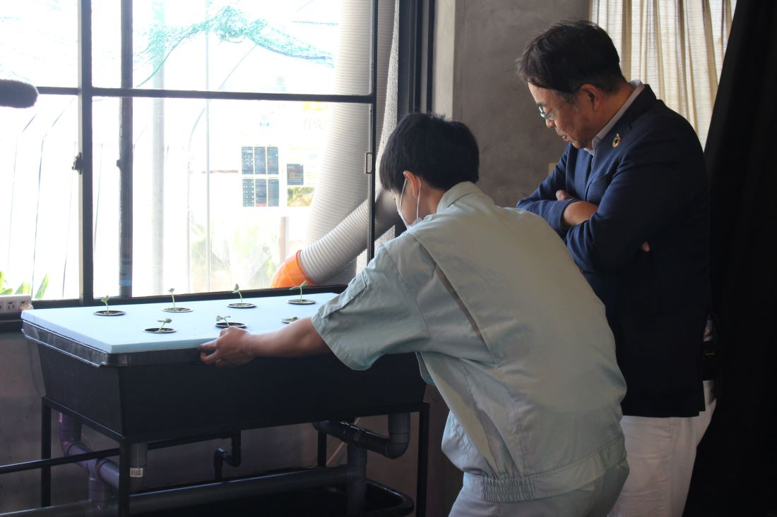 同校では機械科、電気科、電子機械科、工業化学科、設備システム科の全科が連携して昨年7月、好適環境水の水槽でメバル約50匹の養殖実験を開始。そのメバルが排出した窒素、リンなどを養分として野菜を栽培し、魚に有害なアンモニアなどを除去した水を再び水槽で使う「アクアポニックス」に取り組んでいます。装置はほとんど教員と生徒たちの手作りです。生徒たちは毎日、塩分濃度や水質、水温をチェックし、魚の様子などを観察。当初、50㌘ほどだったメバルは130㌘にまで育ち、栽培品種もトマトやメロン、バナナまで広がっています。