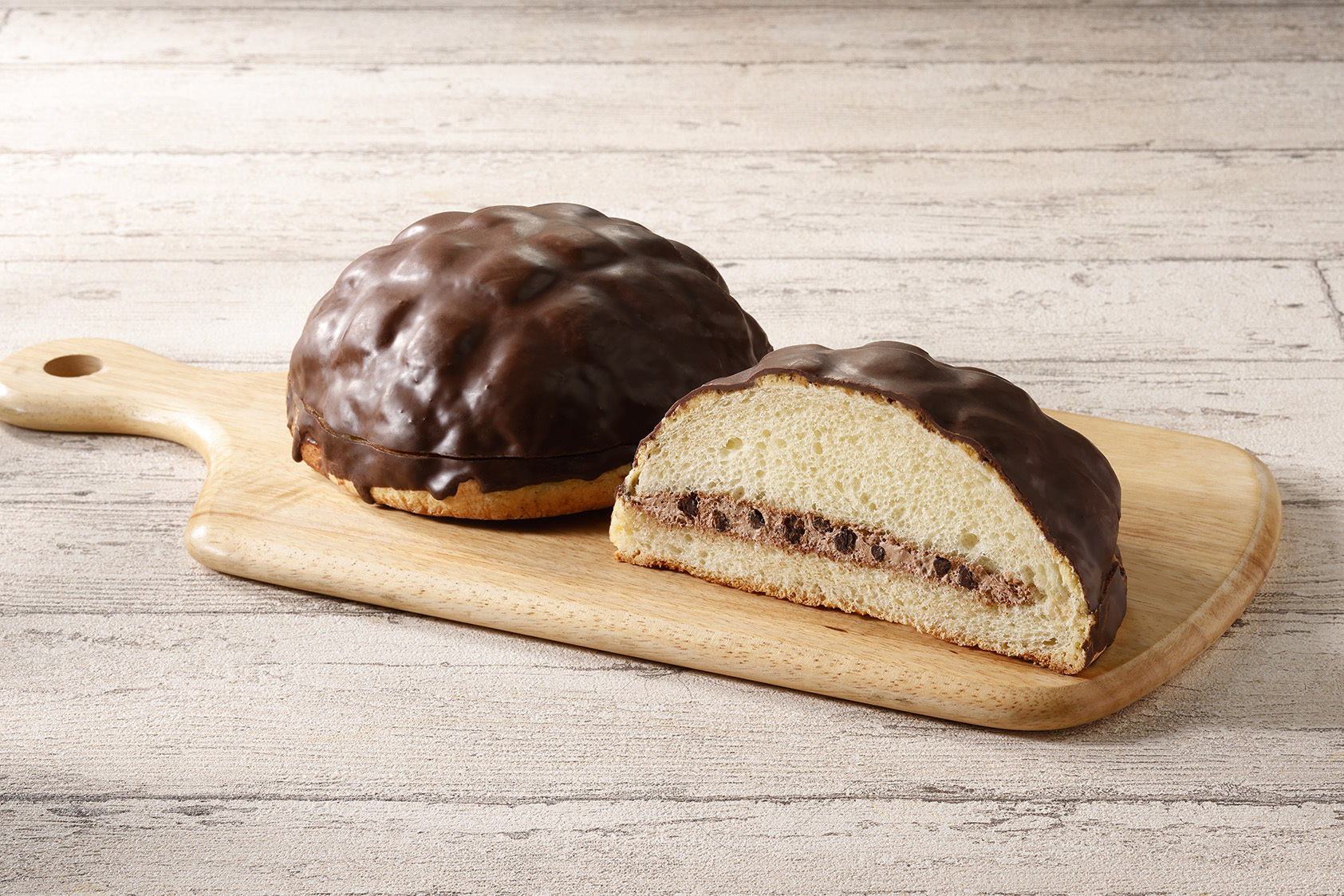 大きなメロンパンをチョコでコーティングしました。さらに、中にはチョコチップとチョコホイップクリームをサンドし、外も中もチョコづくしの仕立てです。生地には、岡山県の蒜山(ひるぜん)ジャージー牛乳を使用しています。