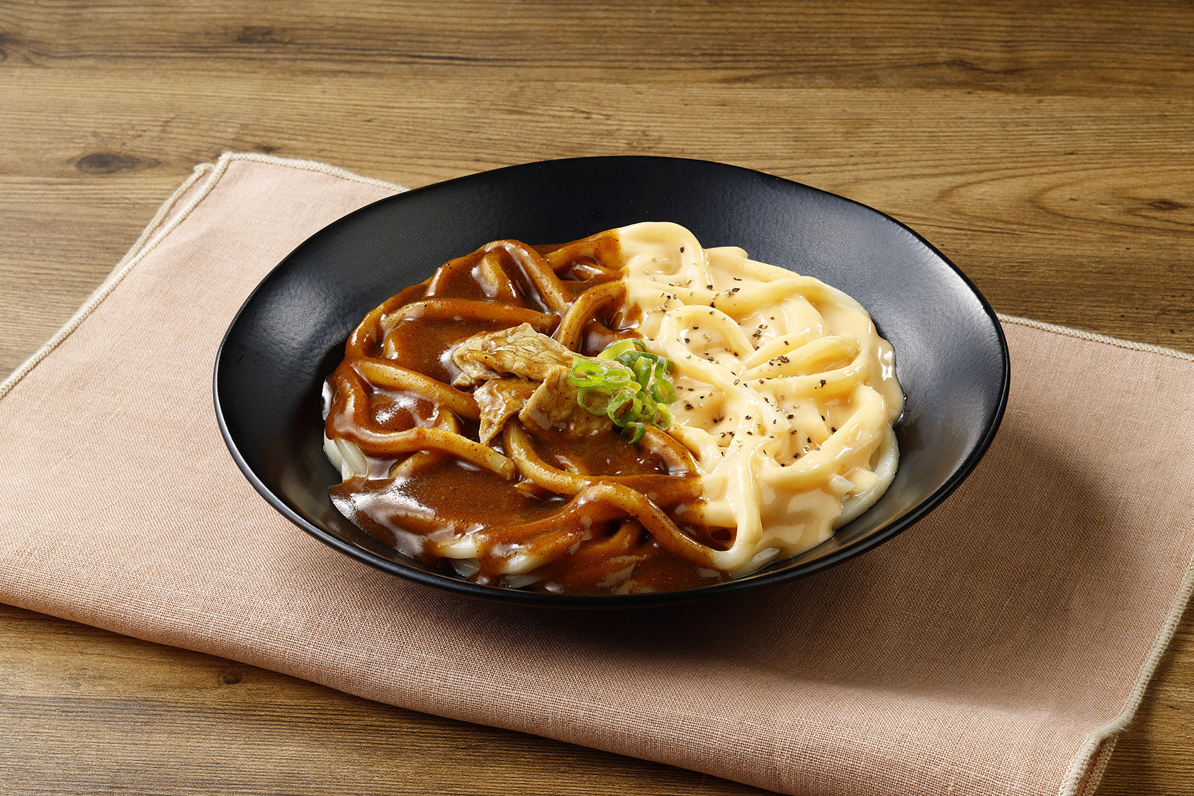 スパイシーなカレーと濃厚なカルボナーラソースの2つの味が楽しめるうどんです。また、混ぜて味変を楽しむことができ、さらに美味しく召し上がっていただけます。