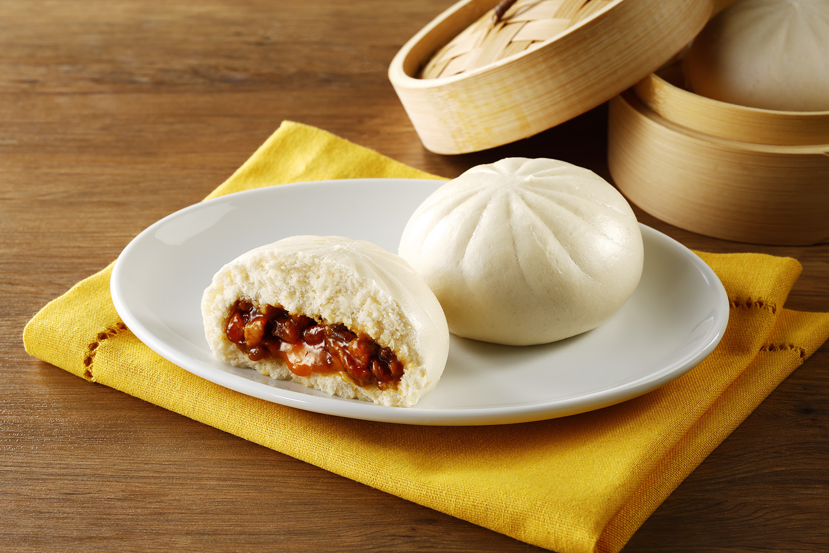 四国地区で人気の焼豚玉子飯を中華まんにアレンジしました。甘辛たれの焼豚と卵黄ソースの相性は抜群です。中華まん什器で販売します。