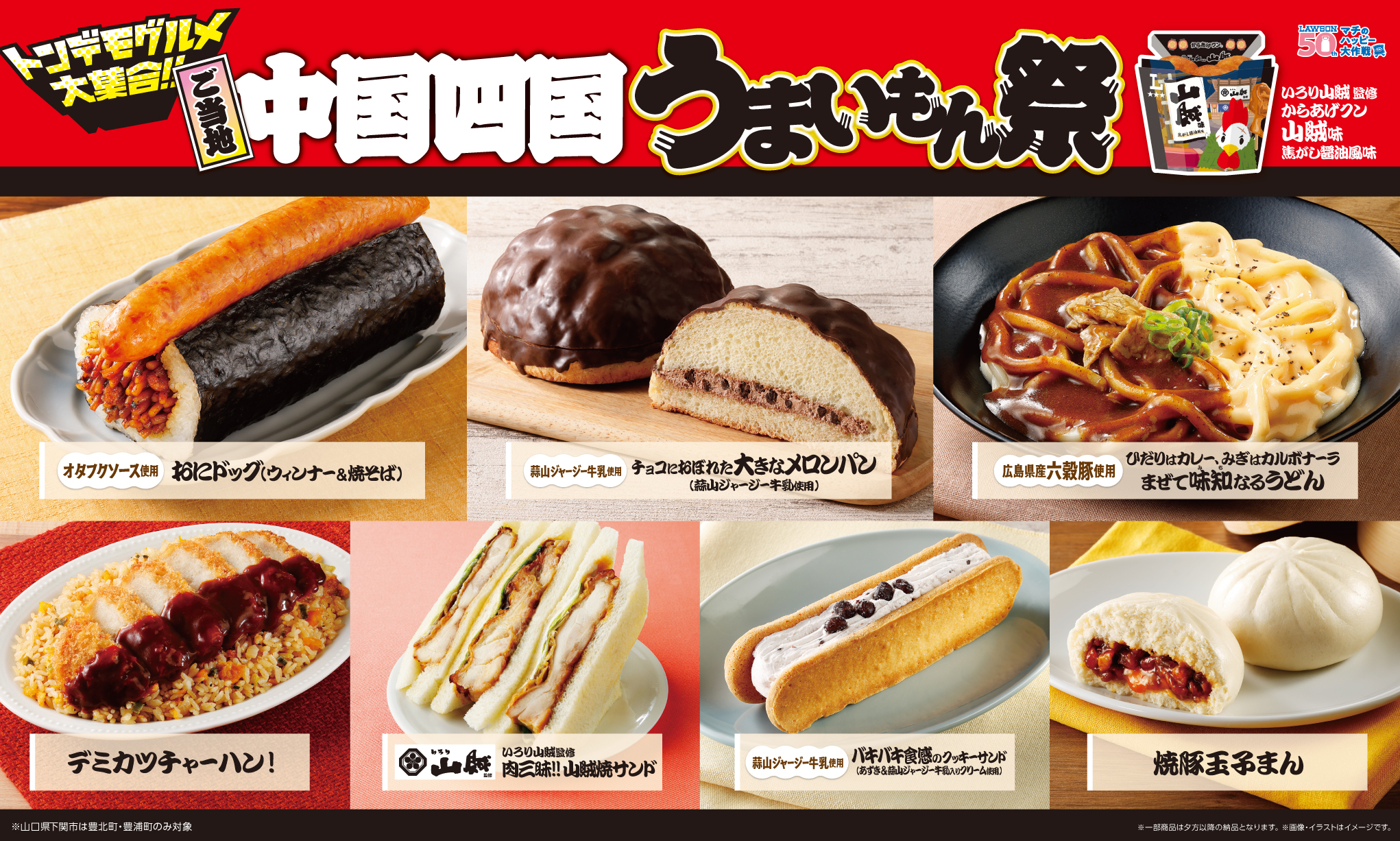 中国・四国地区のローソン店舗(約1,550店:2025年9月末時点、山口県下関市の一部地域除く)では、『からあげクン いろり山賊監修 山賊味』のほか、デミカツチャーハンや山賊焼サンド、地元食材を使用したベーカリーなど計8品を発売いたします。