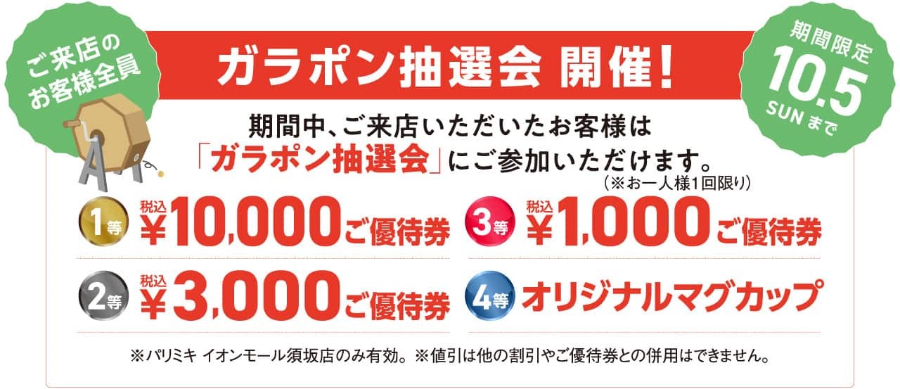 オープン日から10月5日まで期間限定で「ガラポン抽選会」を開催いたします。
