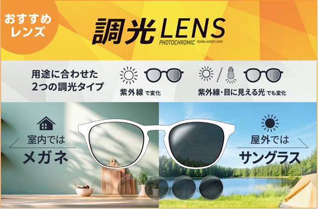 室内ではメガネ、屋外ではサングラスとして、掛け外しの手間が不要な1本2役のレンズです。