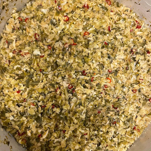 ビタミンCがたっぷり含まれているのにも関わらず、キャベツメンチで使用の出来ないキャベツの外葉を、カツオだしをベースに唐辛子と生姜でピリ辛酸っぱく仕上げました。
