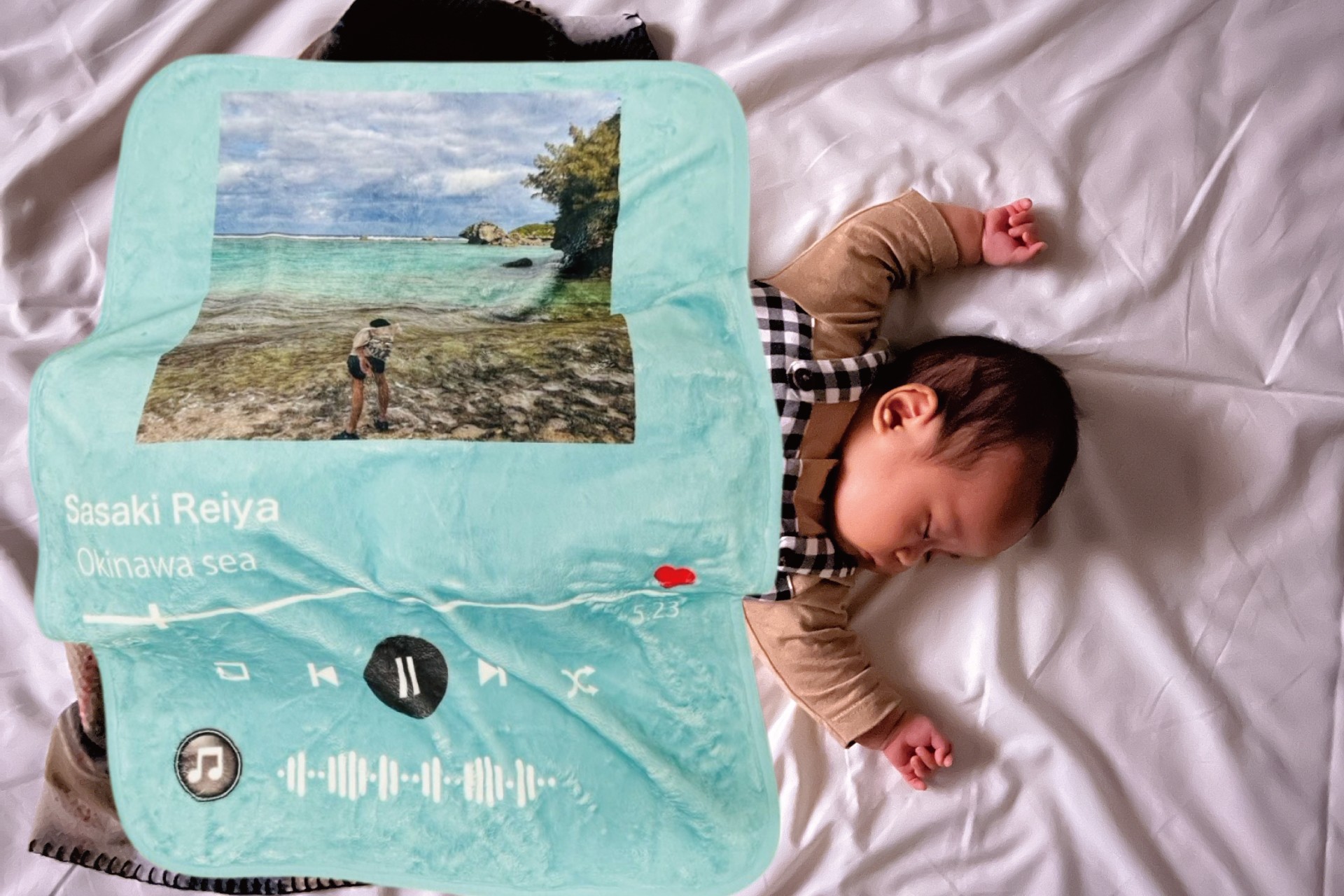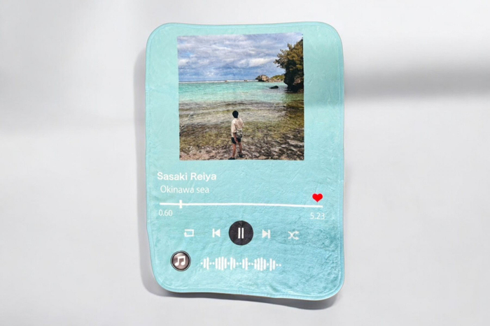 ミュージックプレイ画面ブランケットは、スマホのミュージックプレイ画面をモチーフにしたデザインで、写真の取り込みや名前などお好きな文字を入れることが出来るオリジナルのブランケットです。