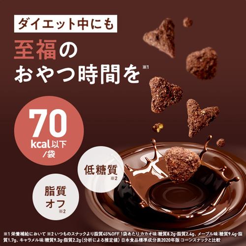 カカオ、メープル、キャラメルの3種類の味を選べて、1袋70kcal、低糖質、いつものスナック菓子より脂質45%オフ※2。おいしく食物繊維や鉄分、ポリフェノールがとれて、たんぱく質入り※3。