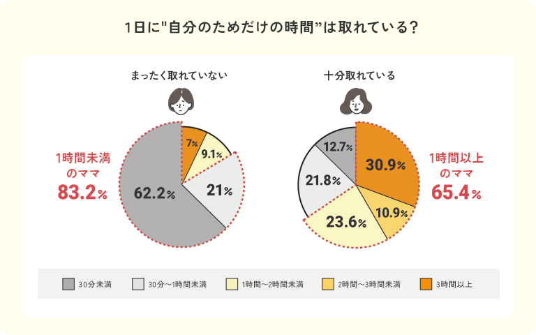 分析の結果、1日の自分時間が1時間未満のママの83.2%が、「時間が取れていない」と感じていることが分かりました。
