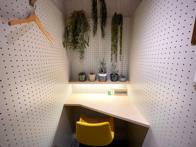 ブース内にはハンガーやちょっとした荷物を掛けられるフック、折り畳み式の荷物置きを設置。快適に過ごせる個室空間です。