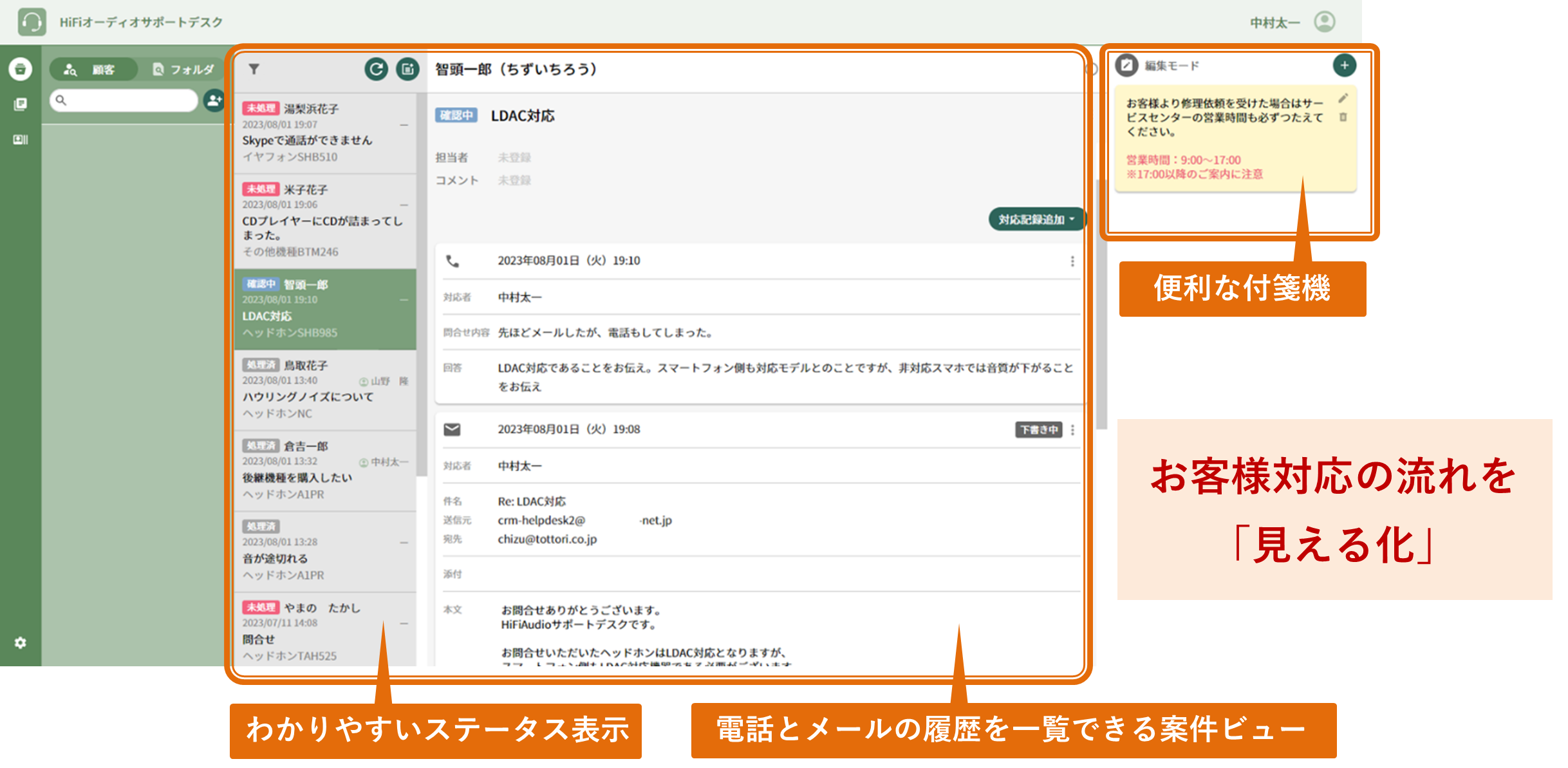 ・注意点やメモを表示できる付箋機能、送信前に確認ができるメール下書き機能を搭載