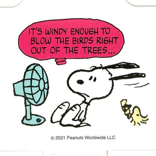 扇風機の前を陣取るスヌーピーのデザインが登場です。風が強すぎてウッドストックが飛ばされているのが笑えます♪