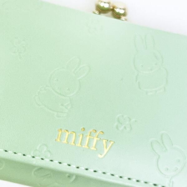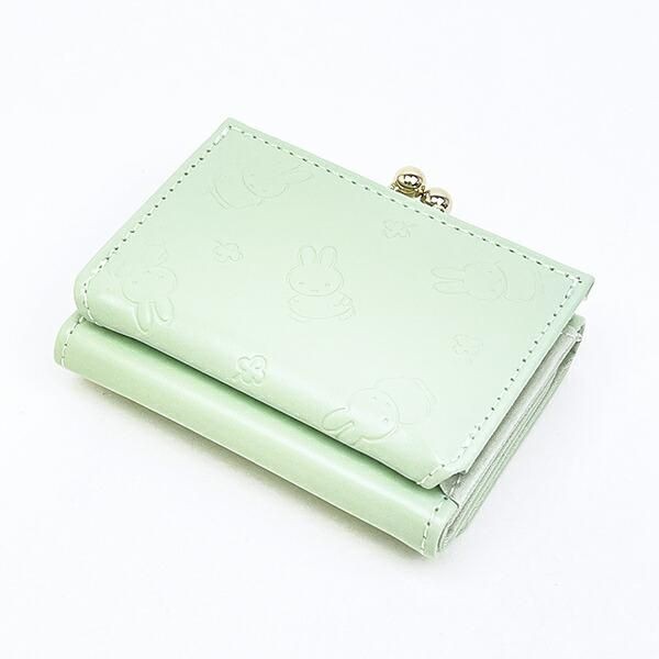 まずは、 **ミッフィー 三つ折り財布 グリーン** から。明るいパステルグリーンをベースとした生地に、ミッフィーの姿が型押しされた大人可愛いデザイン。