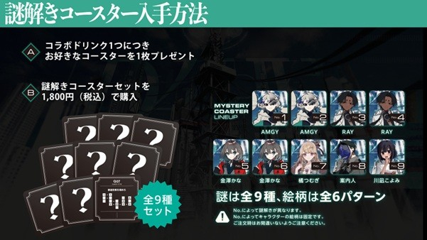 ※「謎解きコースター」は、コラボレーションドリンク1点につきお好きな種類を1枚プレゼントさせていただくほか、1,800円(税込)にてコースター9枚セットの販売も実施いたします。