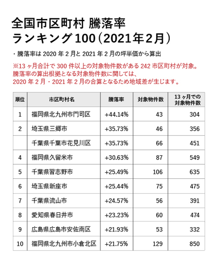 ■全国市区町村 騰落率ランキング100(2021年2月)