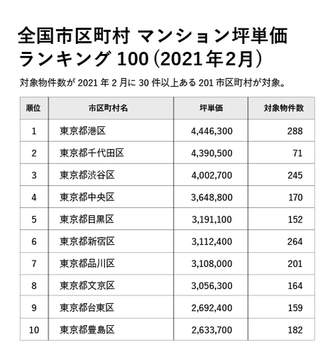 ■全国市区町村 マンション坪単価ランキング100(2021年2月)