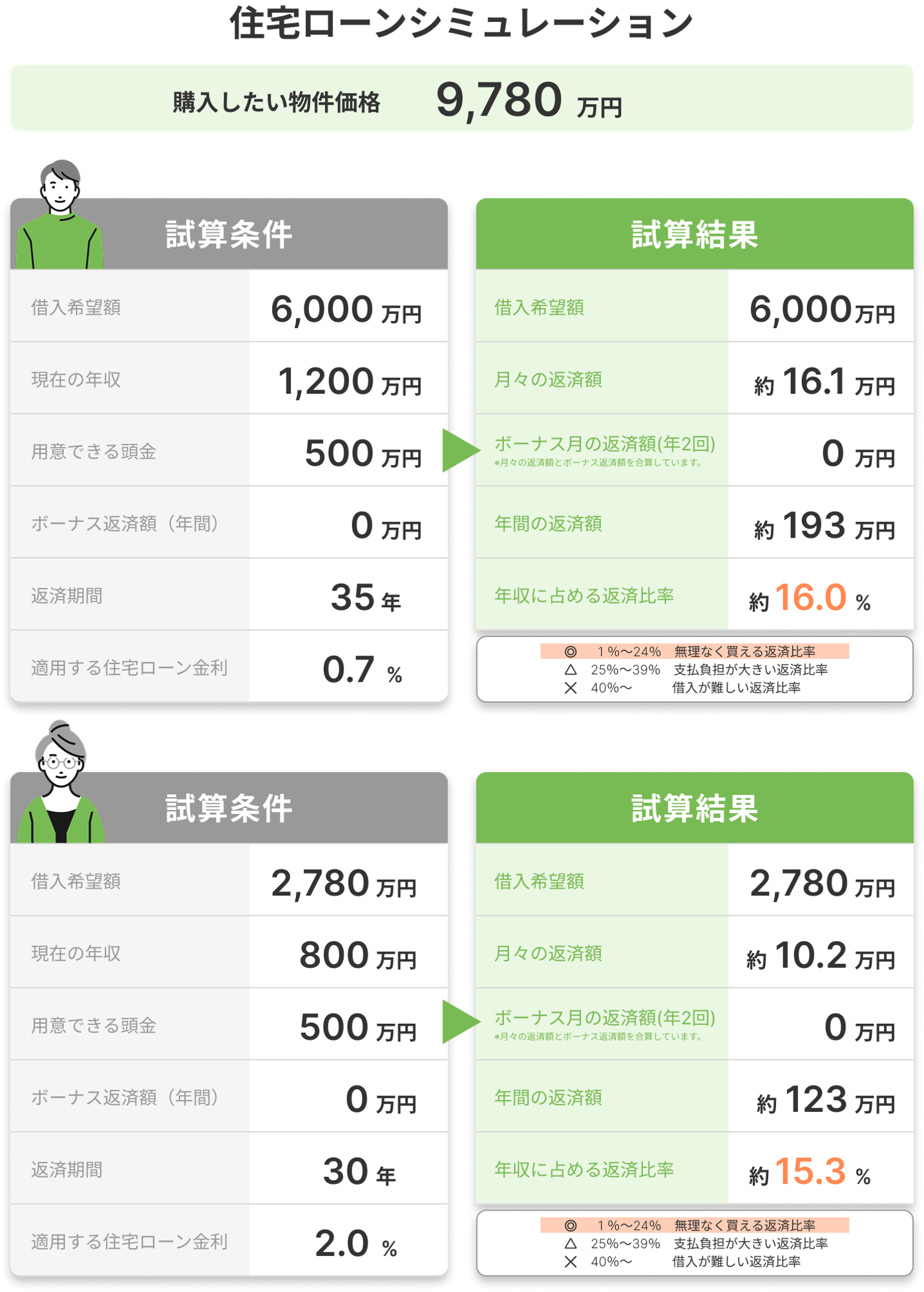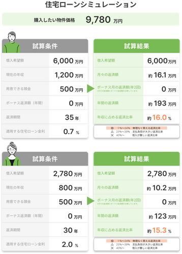 シミュレーションの結果、返済比率約15.8%はフラット35を提供する住宅金融支援機構が公表している返済比率の基準35%を大きく下回り、十分に余裕のある水準と言えます。