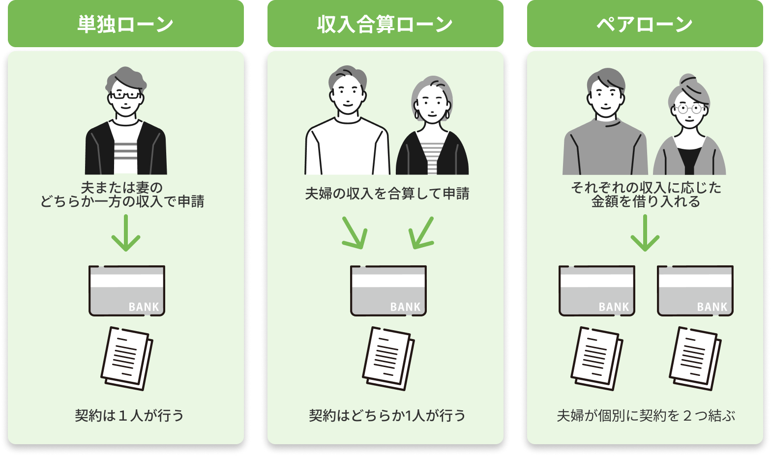 • 単独ローン:1人の収入で住宅ローンを組む方法。従来もっとも一般的な形です。
