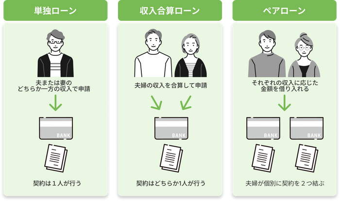 • 収入合算ローン:夫婦の収入を合算し、1本の住宅ローンを契約する方法。
