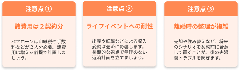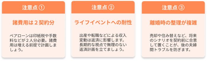 一方で、諸費用が2人分になる点や、出産・転職など将来の収入変動、離婚時の財産整理が複雑化するリスクもあります。メリットと注意点の両面を理解し、長期的な視点で夫婦で話し合い、計画的に活用することが成功のカギです。