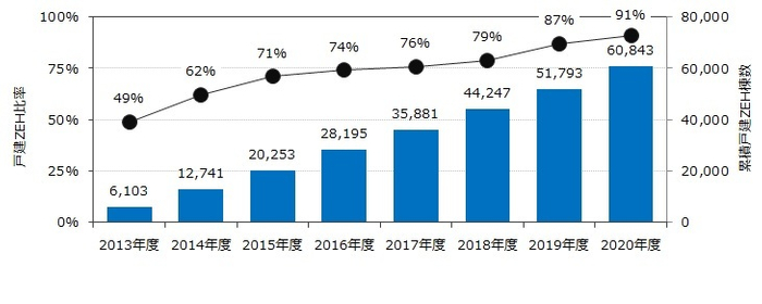積水ハウス株式会社は、2020年度の新築戸建住宅におけるネット・ゼロ・エネルギー・ハウス*1(以下 ZEH)の比率が91%*2となり、第5次中期経営計画(2020年度~2022年度)最終年度までの目標90%を前倒しで達成、累積も2021年3月末時点で60,843戸となりました。今後もZEHの供給により、住まいの脱炭素化を強力に推進し、日本政府の温室効果ガス削減目標(NDC)46%の達成に向けて積極的に取り組みます。
