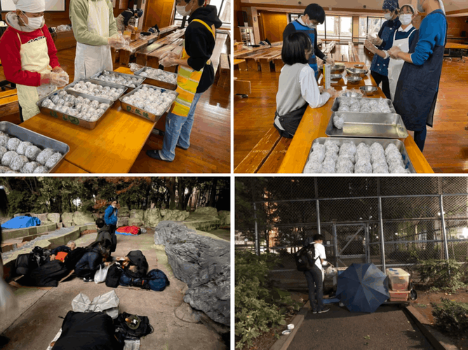 路上生活者などにおにぎりを作って配る活動の様子。
