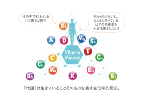 体のビタミンやミネラルが足りないと、身体の代謝がバランスよく回らずにプチ不調を引き起こします。ビタミンとミネラルは相補的にも作用していて、どれか一種類でも所要量に達していないと、代謝レベルはその最も少ない栄養素のレベルに制約されてしまいます。サプリメントを摂るにあたり、効果をきちんと得るためには体の代謝に必要なビタミン、ミネラルを補うことが大切です。