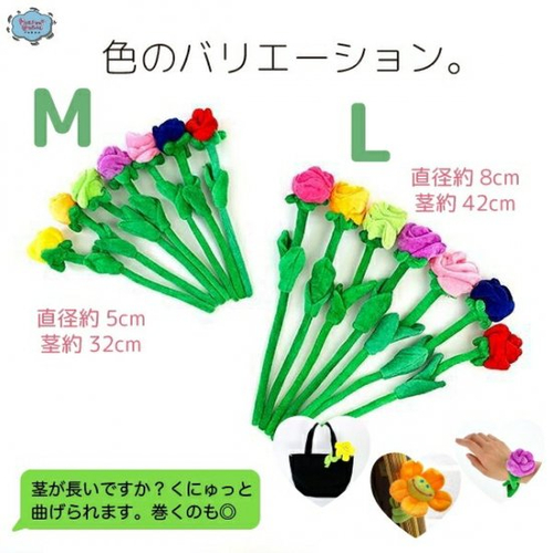 こちらが、ぬいぐるみ花束用のキットです。薔薇タイプのMサイズで5本がセットになっています。他にもLサイズがあるので、バランスや可愛さを考えながらご自分で花束を作っていただけますよ♪