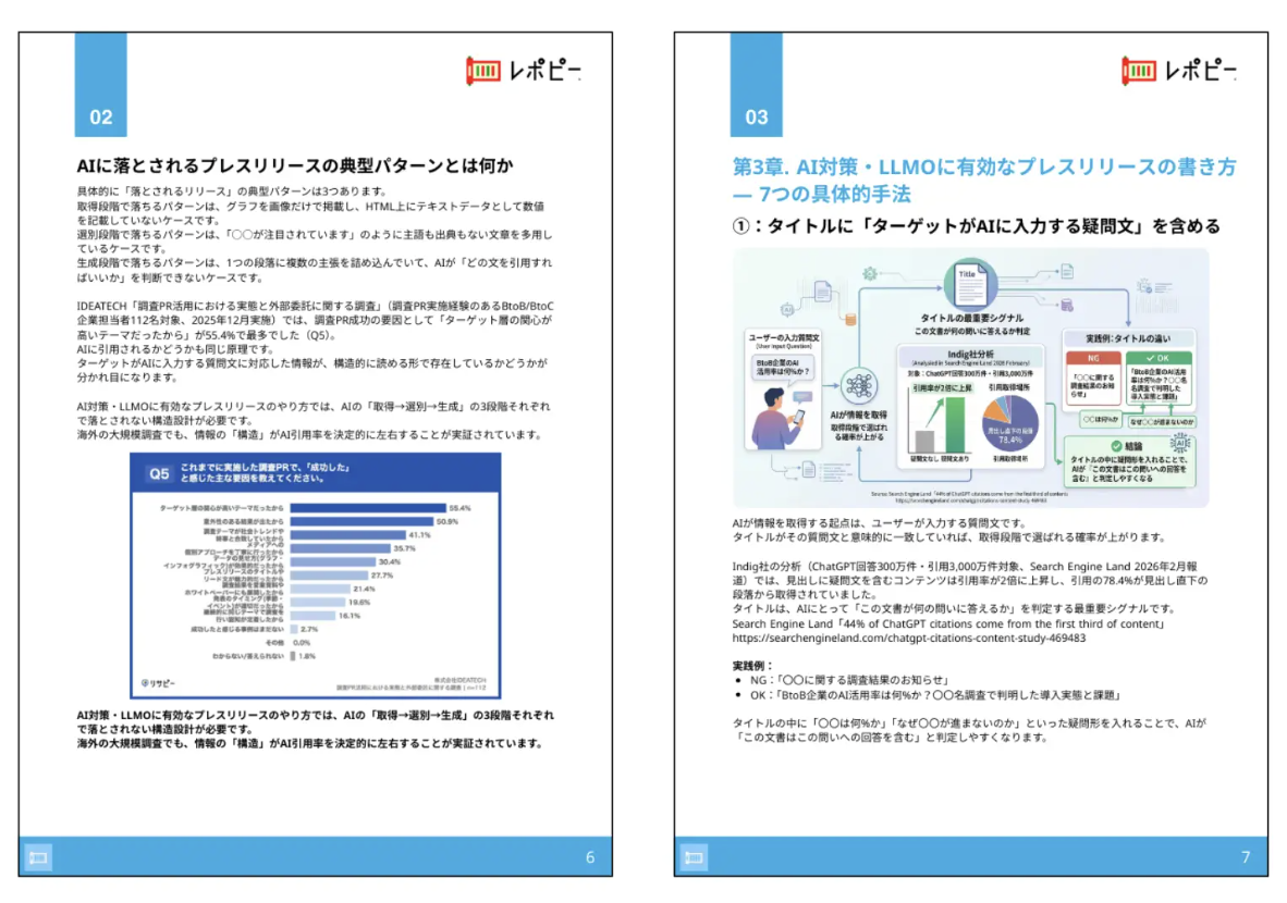 本マニュアルは、AI対策・LLMOに有効なプレスリリースの書き方を「タイトル設計→リード文→本文構成→配信後検証」まで7つの具体的手法に体系化した実践ガイドです。