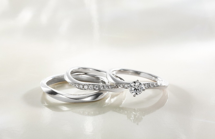 まるで息ぴったりのご夫婦のように、重ねることで輝きを増すセットリングです。自然に寄り添う絶妙なカーブと、流れるようにシンクロする輝きのライン。メレダイヤモンドの大きさ、アームの太さに至るまで緻密に計算し、重ねた時のバランスを追求しました。どちらも同じ職人が手がけたからこそ実現した、吸い付くようにフィットする一体感のある着け心地。コーディネートしやすいセットならではの醍醐味を思う存分お楽しみいただけます。