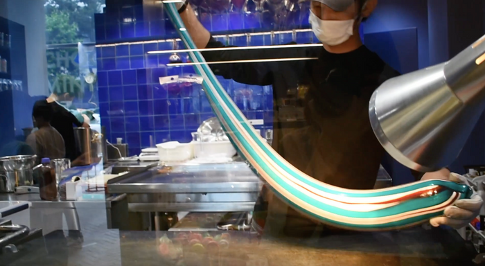 チョコミントの品揃え世界一を誇るパパブブレ青山店では、8月末までの間、店内でチョコミントキャンディの製造実演をしています(不定期開催)。