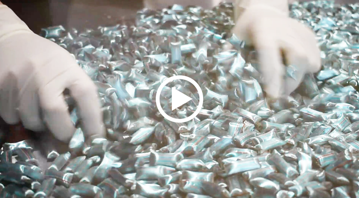 製造工程の最後には、枕型のキャンディが鎖のようにつながった状態になります。そのつながったキャンディをジャラジャラと手で解きほぐして完成させる工程が「気持ちよさそう」「私もやってみたい」と評判になっています。
