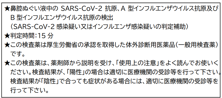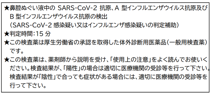 本品は、A型インフルエンザウイルス抗原のほか、B型インフルエンザウイルス抗原、新型コロナウイルス(SARS-CoV-2)抗原を同時に測定することができます。所要時間は約15分です。