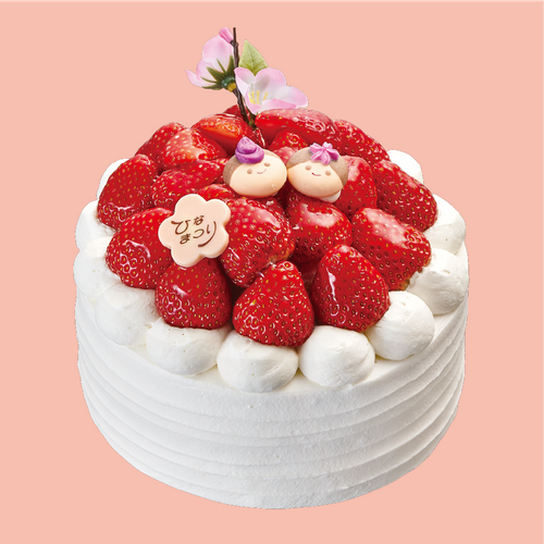 おひな様とたっぷりのいちごをずらりと飾った特別なケーキ。ふわふわなスポンジにフレッシュな生クリームとスライスイチゴをサンドしました。サクラ型のチョコレートや生クリームで彩り華やかに飾った、2段ケーキです。