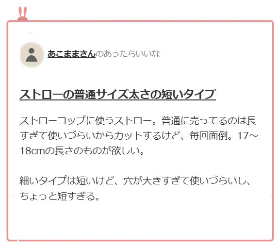 みん100に投稿された内容は、「ストローコップに使うストロー、普通に売っているのは長すぎて使いづらいからカットするけど、毎回面倒。17〜18cmの長さのものが欲しい」という具体的な要望。