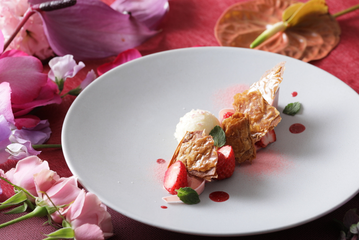 【デザート】愛知県産紅ほっぺ苺のミルフィーユ 蔵王クリームチーズの滑らかなグラス ゲランドのフルール・ド・セルのアクセント