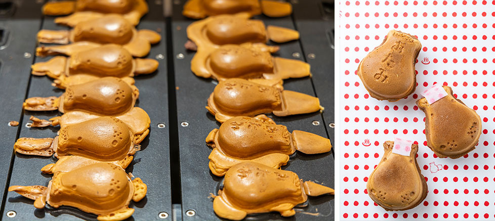 静岡の老舗和菓子店のあんこをたっぷりと使用。作りたての「かばさん」は、まるであつあつ湯上がりのように、頭に手ぬぐいを乗せたユニークな姿でご提供します。