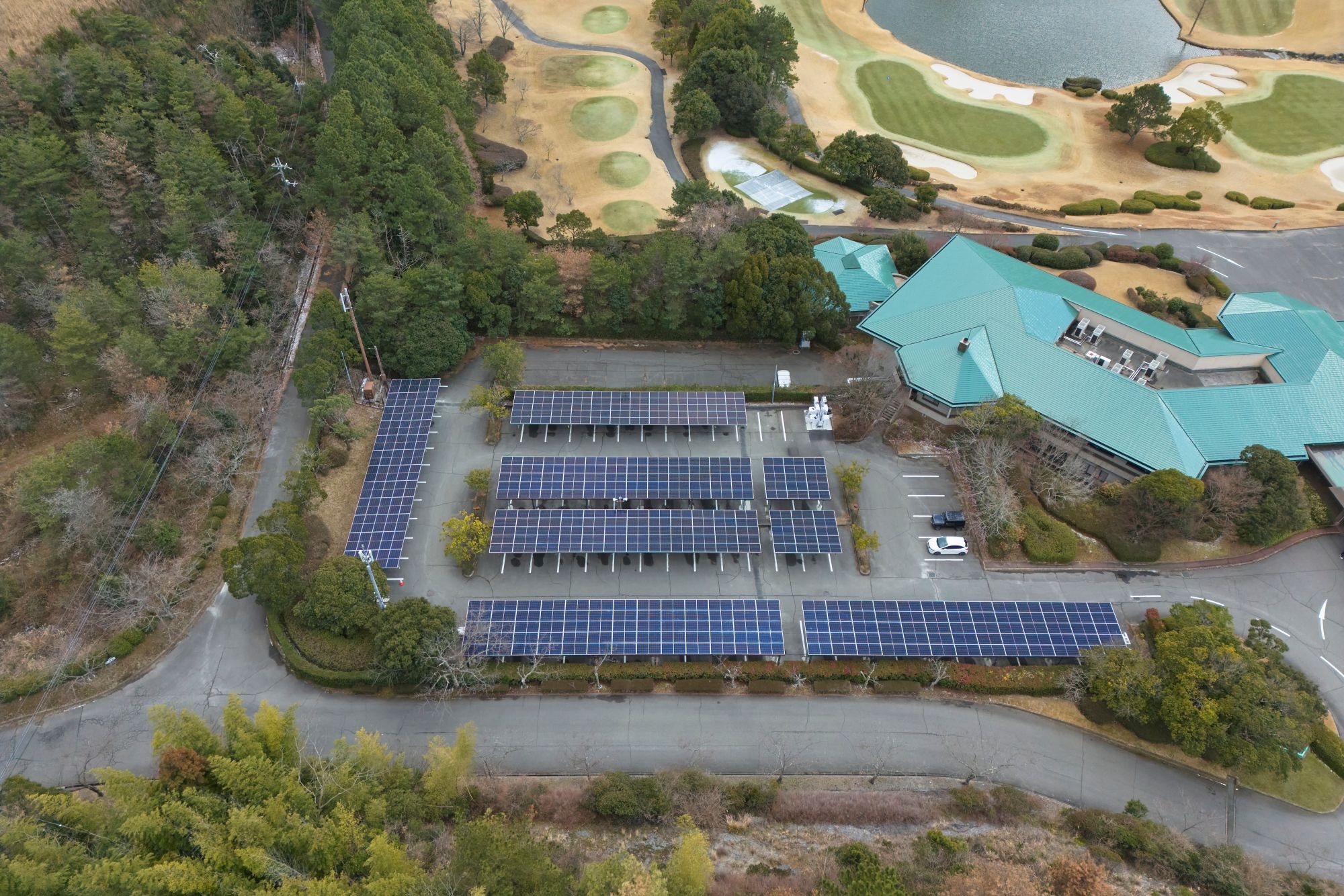 太陽光発電設備を搭載したカーポートを「ソーラーカーポート」と呼びます。リソルグループでは、ゴルフ場の駐車場にソーラーカーポートを設置し、発電した電力をクラブハウスで自家消費することで、運営ゴルフ場における脱炭素化を推進しています。現在、「スパ&ゴルフリゾート久慈」、「中京ゴルフ倶楽部 石野コース」、「瀬戸内ゴルフリゾート」、「入間カントリー倶楽部」においても既存設備が稼働中です。