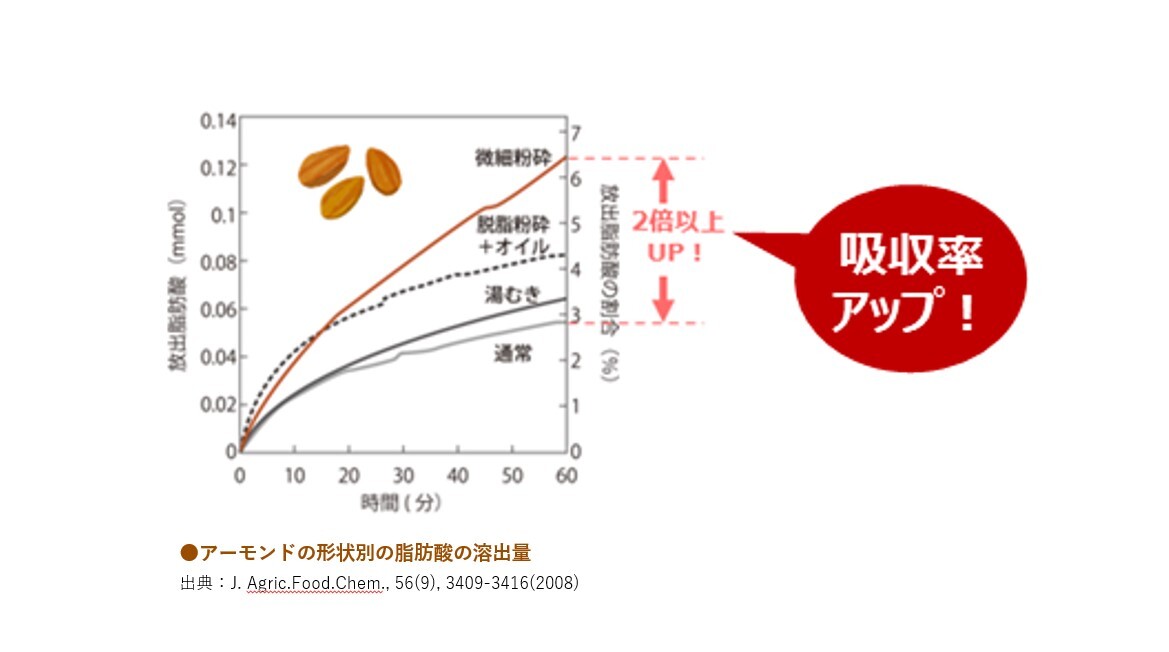 アーモンドに含まれる豊富な栄養素を効率よく摂取するには、細かく砕いてアーモンドミルクとして摂取するのがおすすめです。これは硬い細胞壁を砕いて壊すことで、栄養素を十分に吸収できるためです。実際、細かく砕いたアーモンドは、そのままのアーモンドより2倍以上消化が良いことが示されています。