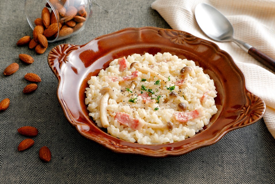*レンチンでかんたん!「きのことベーコンのアーモンドミルクリゾット」