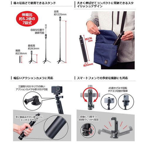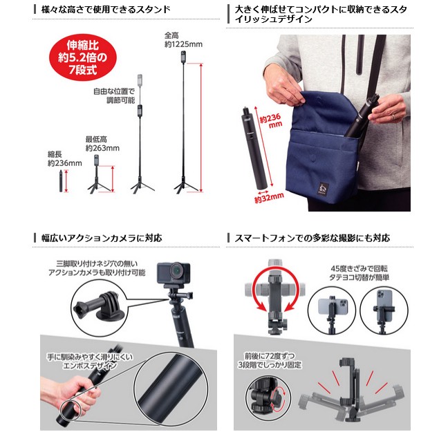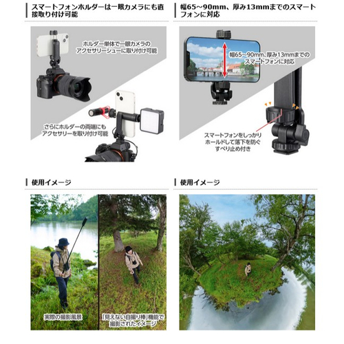 さらに、アクションカメラアダプターと、新たにタテ向き、ヨコ向きやカメラに取り付けられるアクセサリーシューに対応したスマートフォンホルダーが付属し、幅広い機種や多様な撮影シーンに対応するオールインワンモデルです。