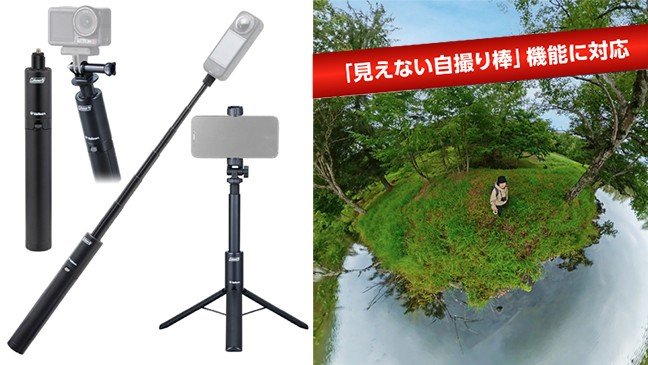 360度アクションカメラでの全天球動画撮影時に、まるでドローンで撮影したかのような「見えない自撮り棒」機能に対応する、スリムデザインの自撮り棒です。
