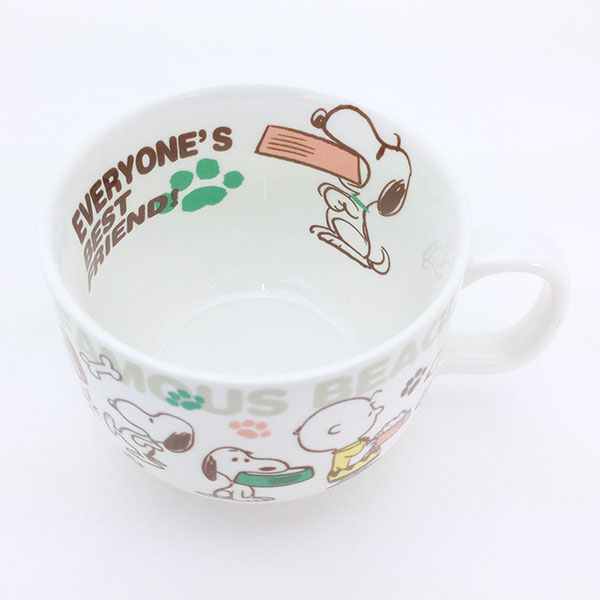 早速ご紹介していきます。淡いトーンのカラーがキュートな、スープマグです。味わいのあるスヌーピーのデザインも楽し気ですね。ワイドな飲み口で、スープもたっぷり入ります。コーヒーや紅茶などの飲み物にも、使いやすい形ですよ。