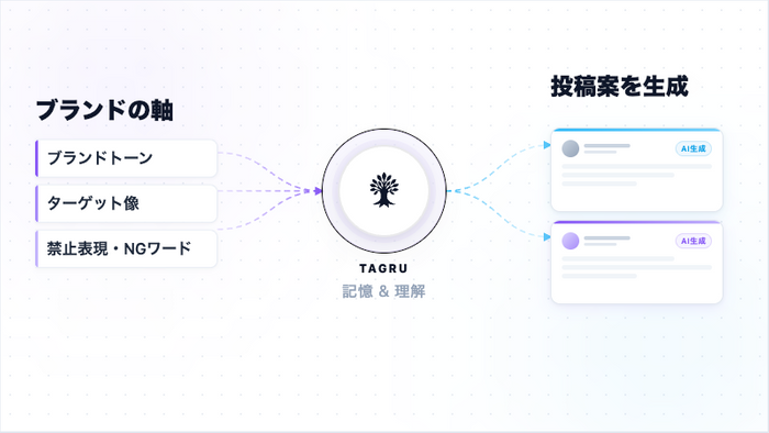 - TAGRUのAI: SNS運用の専門家として、ツール内で最適な投稿案を自動生成・分析。