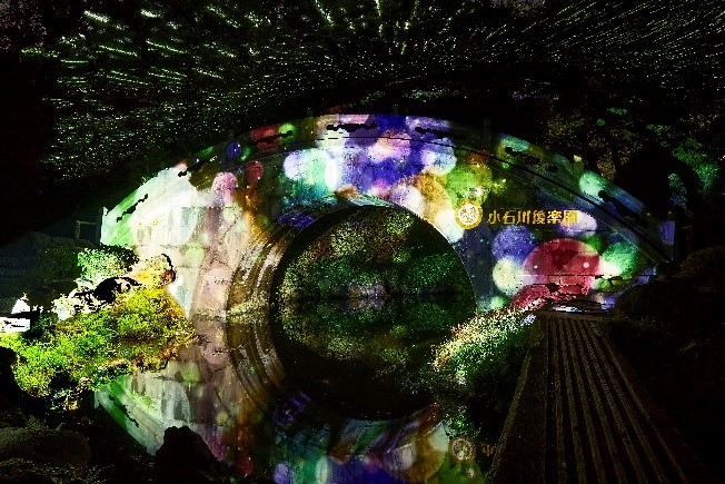 明(現在の中国)の儒学者である朱舜水により、設計されたといわれる円月橋。水面に映る姿と合わせ満月のように見えることから名付けられました。プロジェクションマッピングにより、小石川後楽園395年の歴史を映し出します。